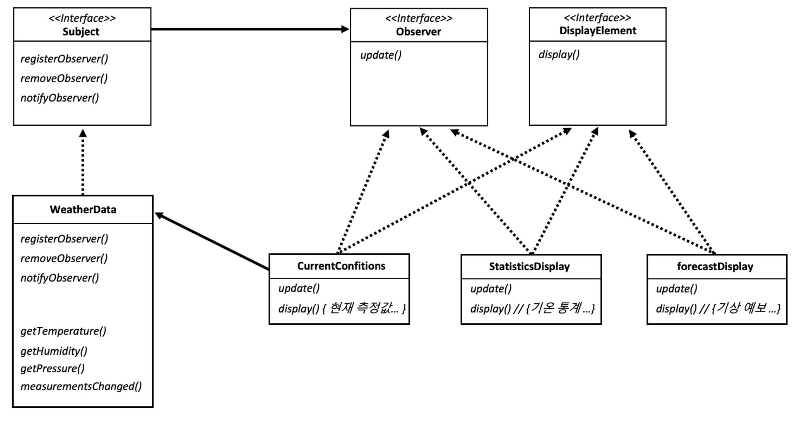- 3개의 디스플레이 객체는 기상 데이터를 업데이트하는 인터페이스(Observer)와 화면에 뿌려주는 기능이 있는 인터페이스(DisplayElement)를 구현한다.