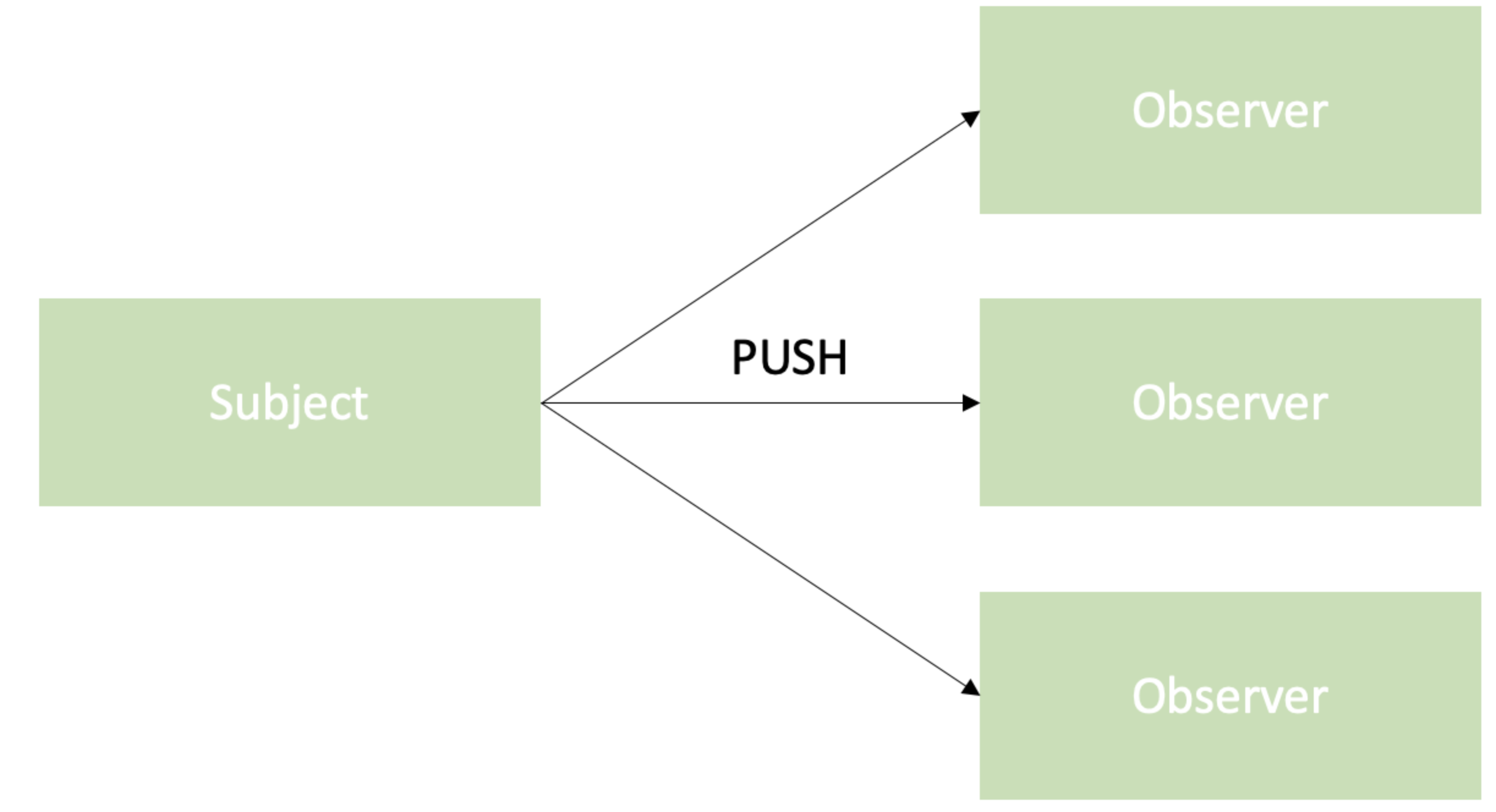 → 옵저버는 주제에 의존하며 주제의 상태가 바뀌면 옵저버에게 연락이 간다. 연락 방법에 따라 옵저버의 값이 갱신될 수 있다.
